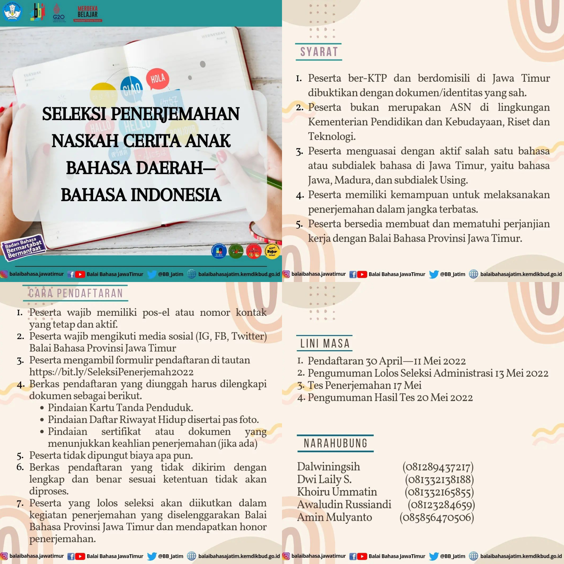Balai Bahasa Jawa Timur ring kanal instagrame @balaibahasa.jawatimur nggawe uwar-uwar seleksi penerjemah. Seleksi penerjemah kanggo nerjemahaken karya sastra cerita anak hang nganggo basa dhaerah kayatah Using, Jawa, Medura diuwah ring basa Indonesia...
