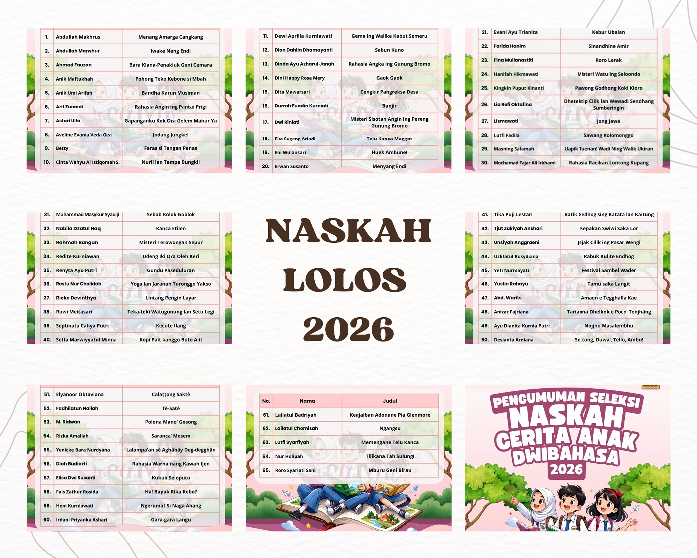 Sakat 2021 sampek seperene, wis Enem taun lawase Basa Using milu urun ring iwuhe Balai Bahasa Provinsi Jawa Timur. Taun iki, ana sepuluh naskah Cerita Anak Basa Using – Indonesia hang arep diuwot BBPJT kelawan digital. Rolas dina (21 Januari – 1 Pebruari 2026), panitiya nguweni wektu kanggo penulis sak Jawa Timur ngelumpukaken naskahe. Asile wis diumumaken Kemis, 26 Pebruari 2026 sabane. Sakliyane 10 naskah teka Basa Using, ana 46 naskah Bahasa Jawa lan 9 naskah Bahasa Madura. Kabeh naskah iki arepe dikenceti liwat Penelaahan Substansi (Isi Cerita). Serehne Penyuntingan Bahasa Daerah lan Bahasa Indonesia ana wayahe dhewek liya dina.