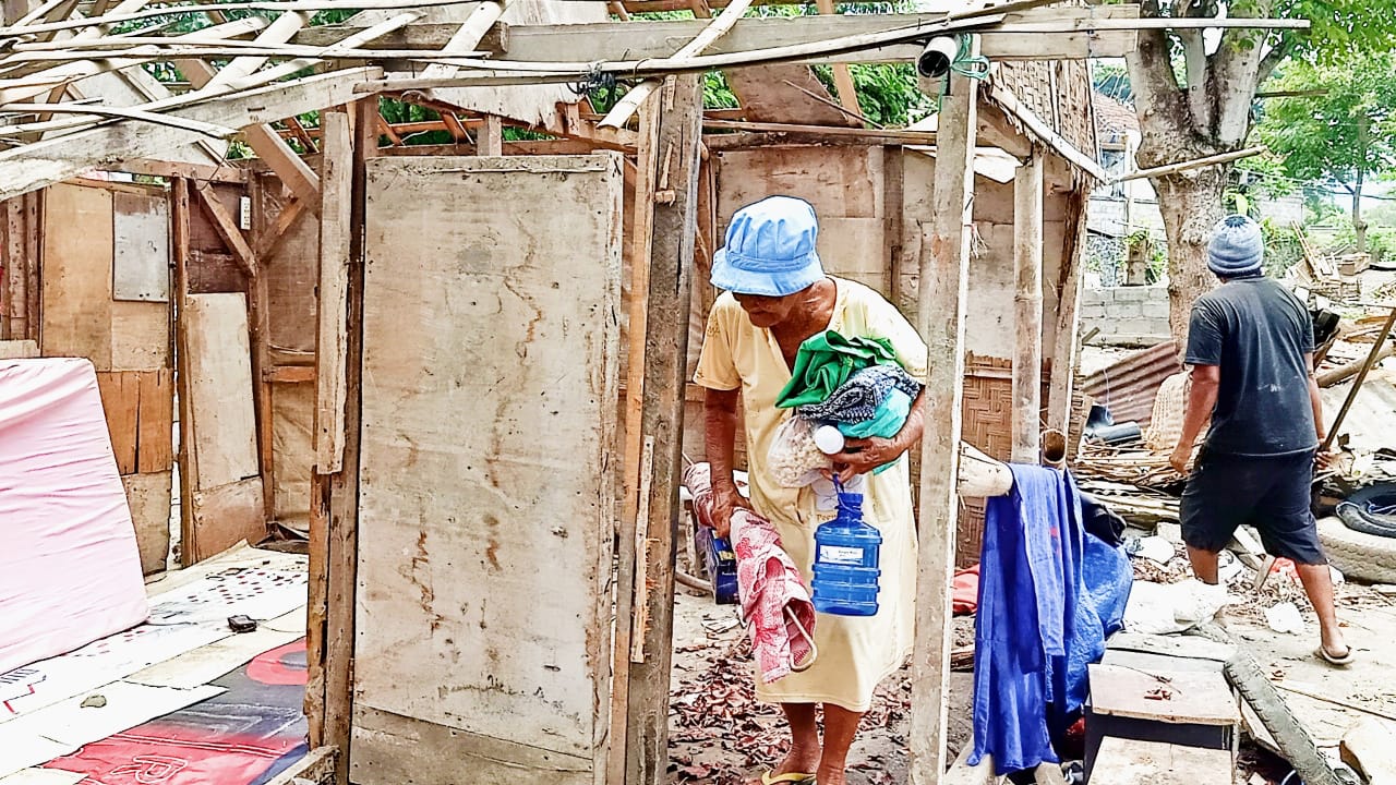 Sutarniah, 95 taun, mung bisa pasrah ndeleng umahe dirubuhaken dina Minggu sore. Puluhan uwong mbongkari umah gedhek pelesteran lemah hang dipanggoni lan kira-kira ana 30 umahe tanggane hang ana ring perengan banyu Unda, desa Tangkas, pecake Gal...